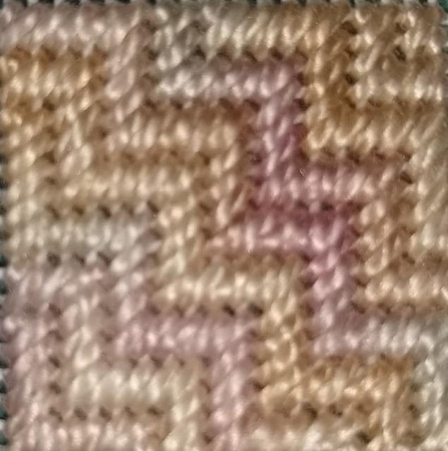 Jacquard Stitch, except for the added rows of continental stitches that separate the Byzantine Stitches within the Jacquard Stitch. The Byzantine Stitch creates a step-like pattern. The size of the steps may vary. For a more interesting look, try using more than one color yarn. Two diagrams have been used to demonstrate this stitch.