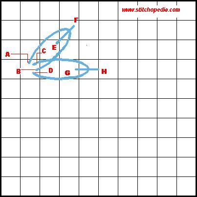 Continue holding your thumb over the loop you have created with your first stitch. Starting where we left off at B, go up 1 canvas thread and move to the right over 1 canvas thread, bring the needle up at E. Move to the right, diagonally, cross over 1 canvas intersection and bring the needle down at F. This stitch should go OVER the chain stitch to anchor it in place. Moving on to the next chain stitch, we start where we left off at F.Go down 2 canvas threads and move to the left over 2 canvas threads, bring the needle up at C (the canvas space we started with). Holding your thumb over enough yarn to cover 2 canvas spaces (as shown), bring the needle down at D (the space we started from). Move to the right over 2 canvas threads and bring the needle up at G. Move to the right over 1 canvas thread and bring the needle down at H. Again, this stitch should go OVER the chain stitch to anchor it in place. Continue in this manner, following Sample 1, below....
