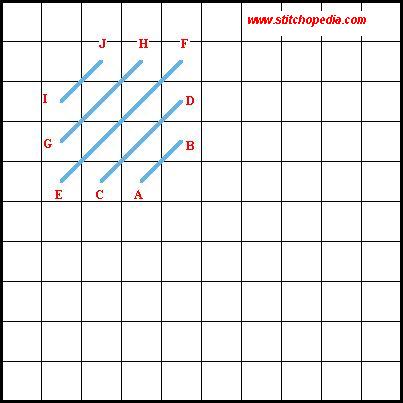 Bring the needle up at A, move up and to the right over one canvas intersection, bring the needle down at B. Bring the needle up at C, move up and to the right over two canvas intersections, bring the needle down at D. Bring the needle up at E, move up and to the right over three canvas intersections, bring the needle down at F. Bring the needle up at G, move up and to the right over two canvas intersections, bring the needle down at H. Bring the needle up at I, move up and to the right over one canvas intersection, bring the needle down at J. This completes the Scotch Stitch part of the Checker Stitch. Now, continue on to Diagram 2....