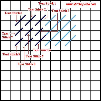 This portion of the Checker Stitch consists of a block of tent stitches. In order to make this demonstration easier to follow, the scotch stitch is shown in light blue and the block of tent stitches are shown in dark blue.The tent stitches are worked in the order that they appear on the above diagram. First, work tent stitch 1. Move to the left and work tent stitch 2. Move down and to the right and work tent stitch 3. Move down and work tent stitch 4. Move up and to the left and work tent stitch 5. Move up and to the left and work tent stitch 6. Move down and work tent stitch 7. Move down and to the right and work tent stitch 8. Move to the left and work tent stitch 9. This completes the tent stitch portion of the Checker Stitch. Now, continue on to Diagram 3...