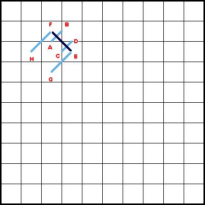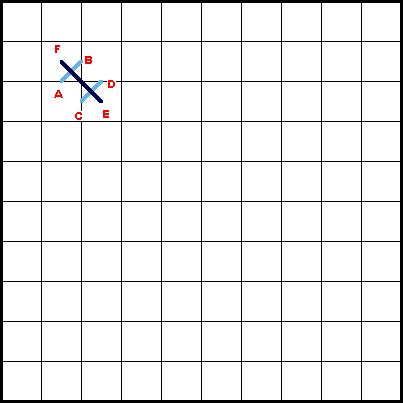 This part of the stitch is illustrated in dark blue. Beginning where we left off at D, bring the needle up at E, move up and to the left over one canvas thread, bring the needle down at F. This tent stitch is worked OVER the two previous stitches. Now, continue on to Diagram 3...