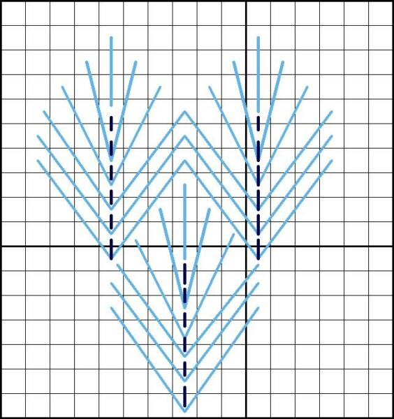 This diagram illustrates how a second Leaf Stitch should be worked into the first Leaf Stitch and how the next row should be worked into the first row.