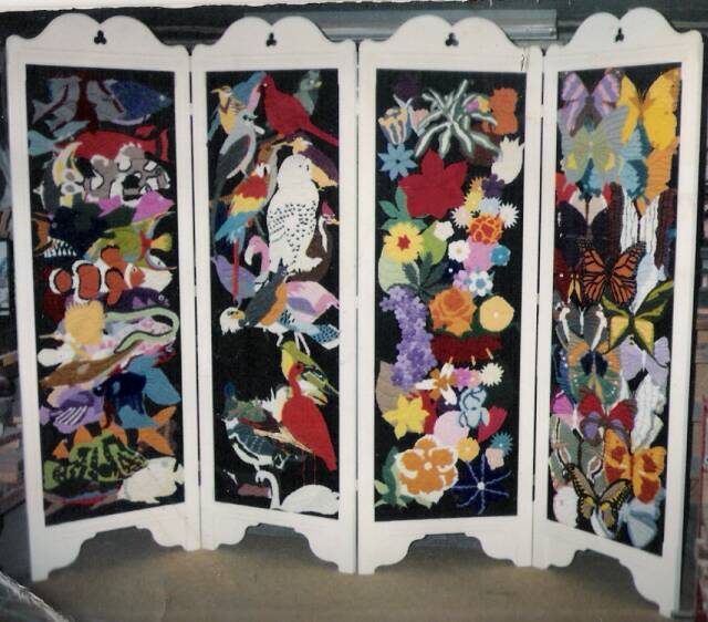 I named this piece "The 4 F's" (fish, fowl, flowers, flutterbys). This project is a free-standing, four piece, hinged room divider that stands 6 feet tall with the hand carved frame. Each section is 2 1/2 feet wide, plus frame.
