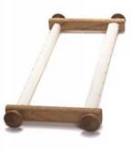 Scroll Frame: This frame consists of two dowels that fit into two straight sides. The sides are generally secured by screws on each of the four corners. These screws are used to tighten the sides to the dowels. Scroll Frames are especially useful for large pieces. The canvas would be attached (flat-head thumbtacks are best) to each dowel, with the bottom dowel being turned - or scrolled - until the canvas is tight. The sides of the canvas would then need to be attached to the two straight wooden sides. Again, flat-head thumbtacks work best. This pulls the canvas in four directions. Once you have finished working the area that is visible, simply remove the side thumbtacks, unscrew the tightener screws, roll (scroll) the canvas up until you reach the next portion of your piece, tighten the tightener screws and attach the canvas to the sides, again, with flat-head thumbtacks.